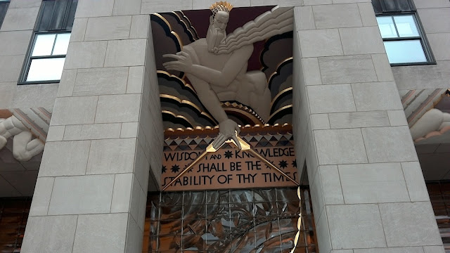 Qua ci troviamo davanti all'entrata di quello che è altrimenti conosciuto come 30 Rock, dove si può leggere la citazione presa da Libro di Isaia 33:6.